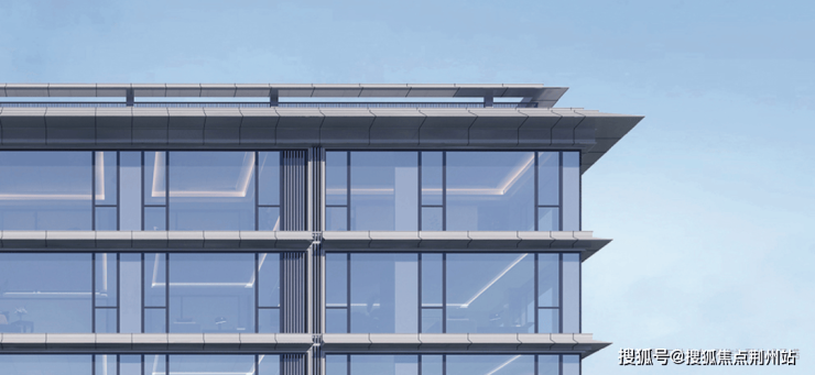 远远望去,三幢建筑宛若玻璃盒子镶嵌在公园内部,由“奥本海默蓝”全落地玻璃和灰色系铝板组成的外立面,在阳光的照射下,熠熠生辉。仔细看项目的每一层,都有铝板挑檐,心思精巧,细节拉满。