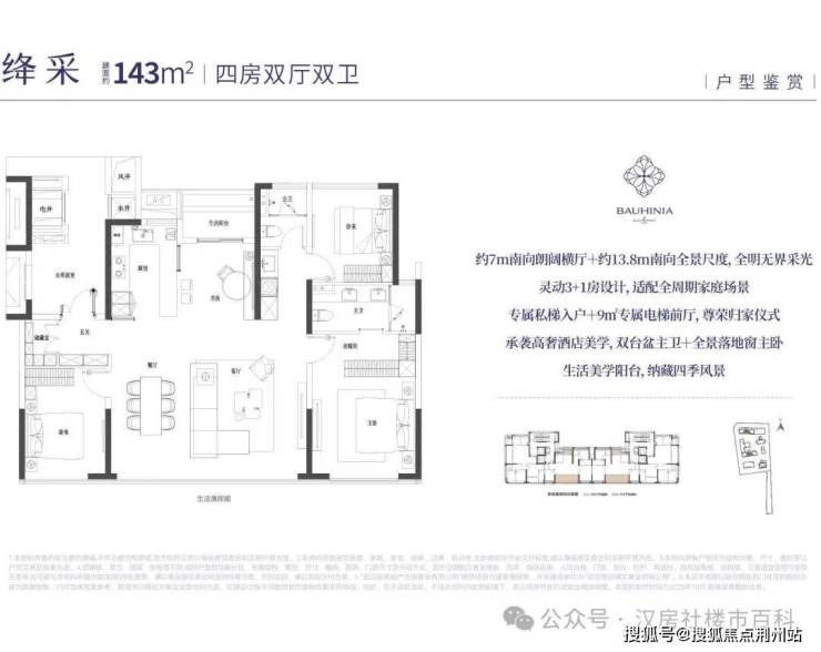 项目共 4 栋楼,其中有1号楼2个单元31层,均为143m²户型;2号楼独单元31层,均为180m²户型;3号楼2个单元32 层,均为143m²户型;4号楼独单元31层,均为143m²户型。项目预计首开 1、2 号楼,所有楼栋均为 2 梯 2 户的独梯入户。