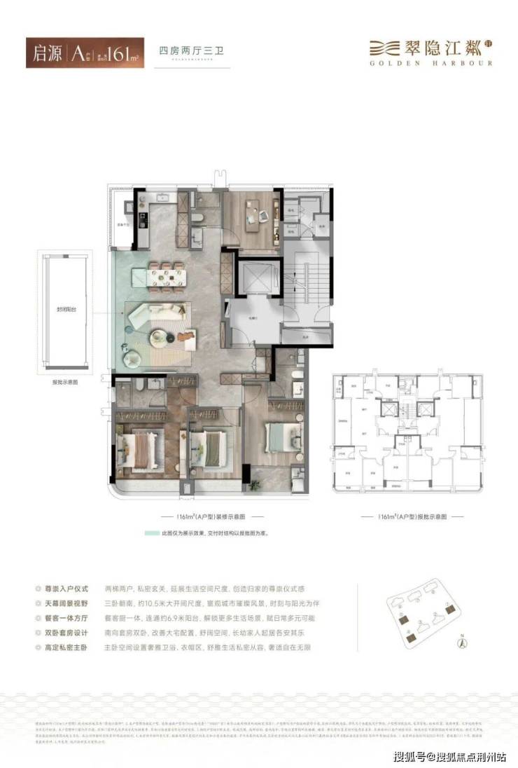 在杭州目前新房市场中,使用率能真正做到约90%的楼盘,凤毛麟角。翠隐江粼轩通过封闭阳台只算半面积+电梯厅空间转化(公区),实现使用率最大化。建筑面积约230㎡户型更是做到了近66㎡客餐厅+双套房布局,空间感媲美很多二手老豪宅的260㎡。