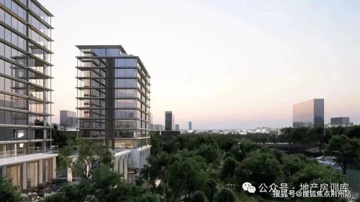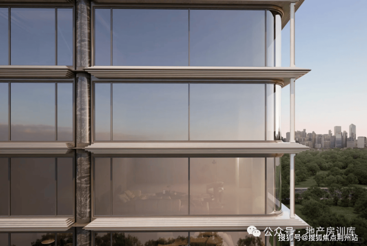 最中间一层,做了古铜色金属挑檐,另外八层则是弧形折面,以金属挑檐为中心,往上下两侧兵分两路,层层递退,变成了两个中轴对称的「镜像坡屋顶」。