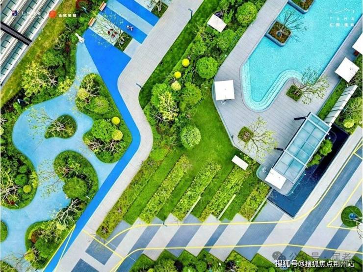 蓝色的马赛克池底在阳光下波光粼粼,仿佛把一座度假酒店的泳池搬到了业主楼下。站在岸边,四周高大树木倒映在镜面戏水池,堪比一座花园小岛树池。