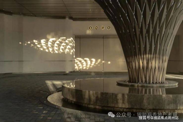 约250米长的超长景观墙界面,以及42m宽、4.8m高的仪式感门厅,入口采用酒店式环岛落客,中心设置寓意「天下四聚」的艺术装置,不仅展现出归家的蕴贵门面和仪式感,还与苏扇工艺打造的黄金池底基座互相辉映。