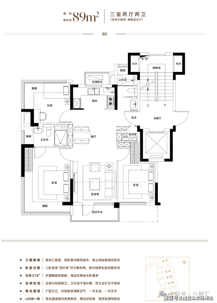此次公开的建面约89㎡第四代纯洋房展示空间,以“三室两厅两卫”全能布局亮相,实现三面朝南。卧室采用“四叶草”式分散设计,互不干扰;重点是不仅仅是主卧配备270°飘窗引景入室,北次卧同样270°飘窗瞰景!空间平权之上,视野也讲究均好性!
