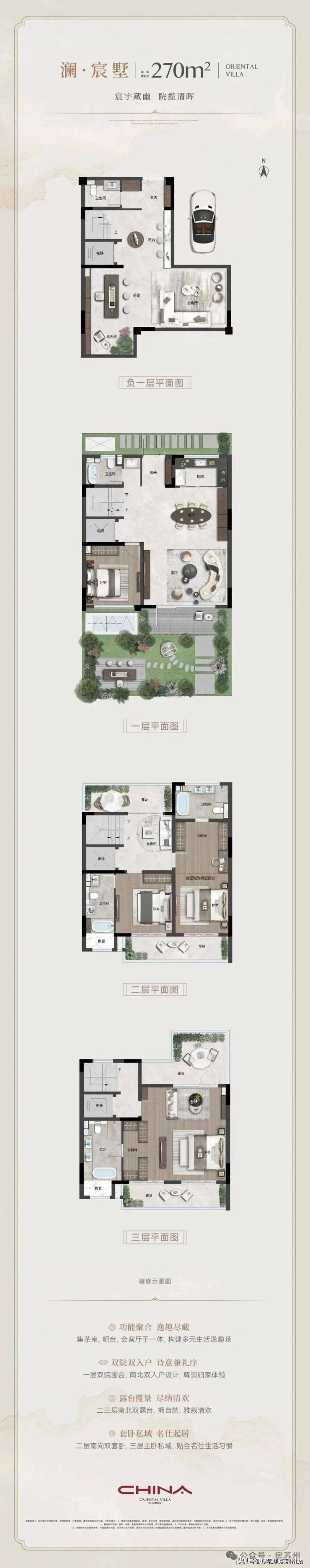 户型设计:主力户型约270㎡和300㎡,带南北双庭院、露台及挑高空间,实际使用面积大。