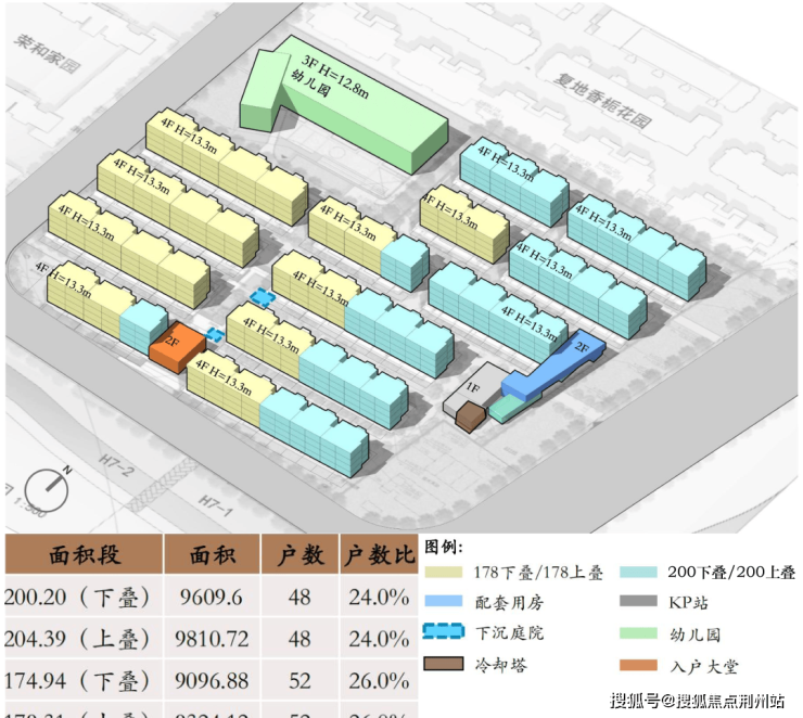 该地块拟建设13栋4F叠加别墅,有4个主力户型,包括建面约178㎡上、下叠,建面约200㎡上、下叠。其中,建面约178㎡上下叠主要分布在地块西侧,建面约200㎡上下叠主要分布在地块东侧。