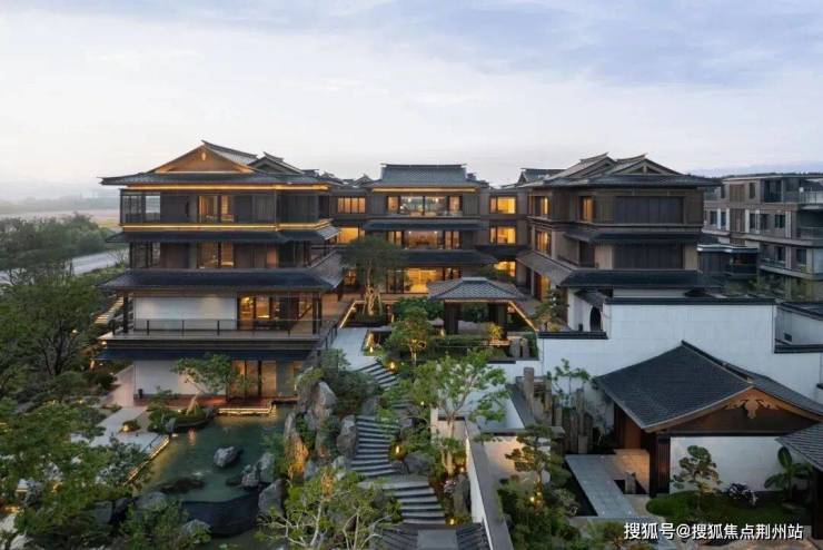 建筑立面:古今交融的诗意表达:外立面以香槟金铝板为基调,搭配蓝眼睛石材与玻璃幕墙,融合传统歇山重檐、纳福悬鱼等元素,既保留宋式建筑的对称美学,又赋予现代建筑的轻盈通透。合院组团采用三面庭院设计,L型景观面与环绕式檐廊,将超山梅影、丁山湖光引入每一扇窗景!