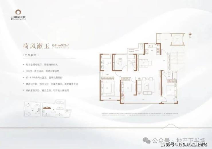 建面约163平四室两厅三卫是小区主力户型之一,位于6+1层洋房上:私享独立电梯,约14.5米南向四面宽让功能空间尽揽南向采光;大宽厅、双阳台设计,搭配双南向酒店套房,生活的尺度感被尽情拉满。