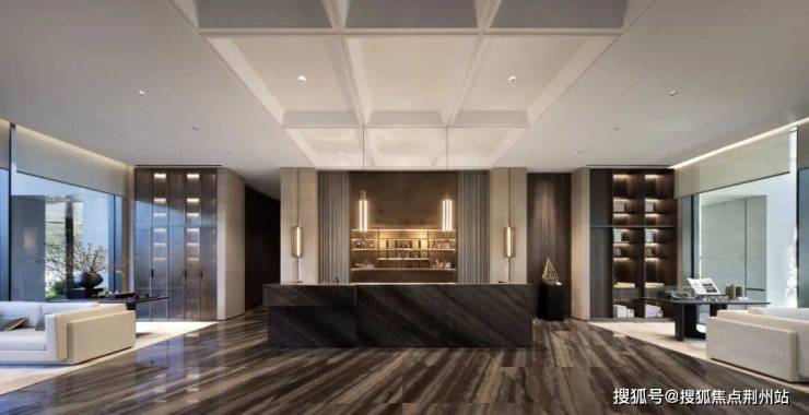 归家大堂被做成了极具东方意境的“金玉满堂”:定制的“缘起”艺术品、地面的静雅棕奢石、悬垂四周的水墨玉石墙,每一寸肌理,都散发着奢玉的温润与高雅。