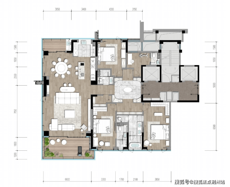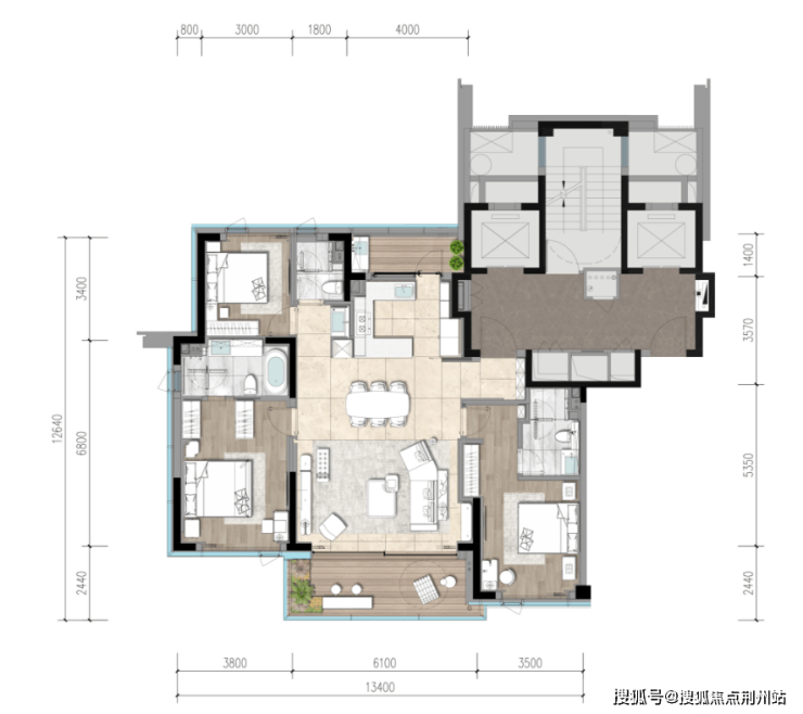 建面约160㎡户型,把“实用”玩出“奢感”,两梯两户,三室配了三卫,居中的一体化餐客厅超懂生活,几乎所有空间都利用到了实处。
