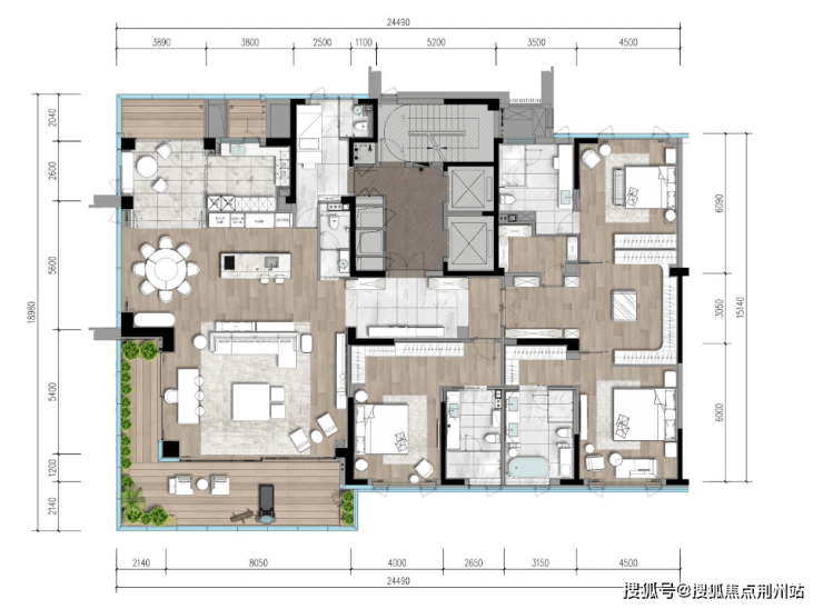 例如建面约260㎡户型,入户是居中的大面积玄关,像 “气场中转站”,归家仪式感和收纳实用性一把抓。约6.6 米大宽厅搭配南北双阳台,北阳台扛起“后勤烟火气”,南阳台直接框住“景观大片”。