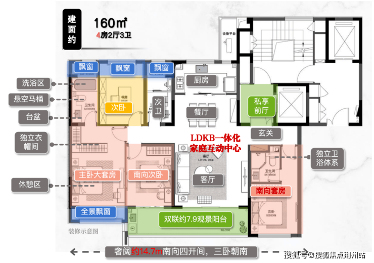 建面约183㎡户型一大亮点,就是LDKB一体化设计,厨房+餐厅+客厅+阳台面积超过72㎡,公区家庭互动区面积相当于他人整个家,十分气派!