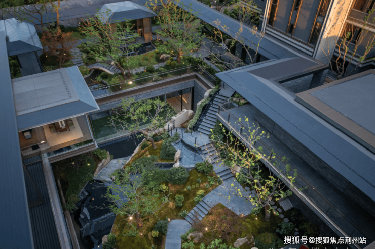 再往里走就是近460㎡的下沉式庭院,精选太行山金景石堆叠成小山丘,引进溪水汇聚成池塘,并移栽岭南珍贵的古桩铁冬青和中华原生乌桕树,形成一幅立体山水画卷。
