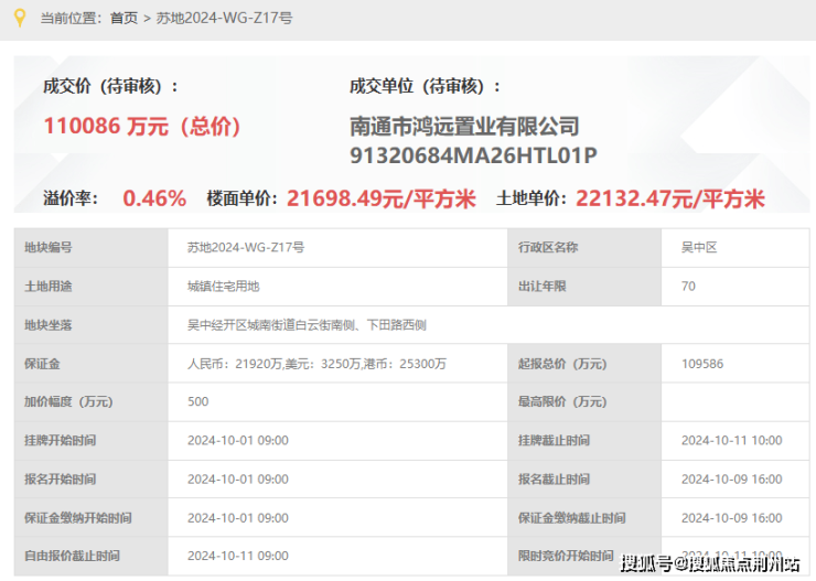 该地块(苏地2024-WG-Z17号)是南通市鸿远置业(南通海门国资背景)以总价11.01亿竞得,楼面价:21698.49元/平,溢价率0.46%。