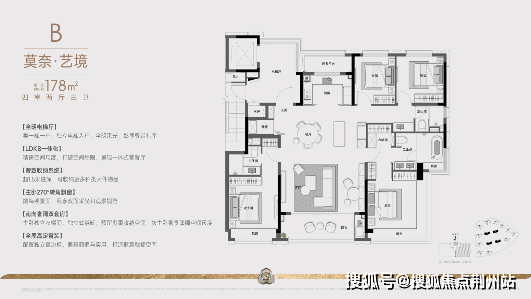 1.四室两厅三卫,南向双套房。约43㎡奢阔方厅可自由布局,客餐厅无梁一体化吊顶,LDKB一体化南北通透;