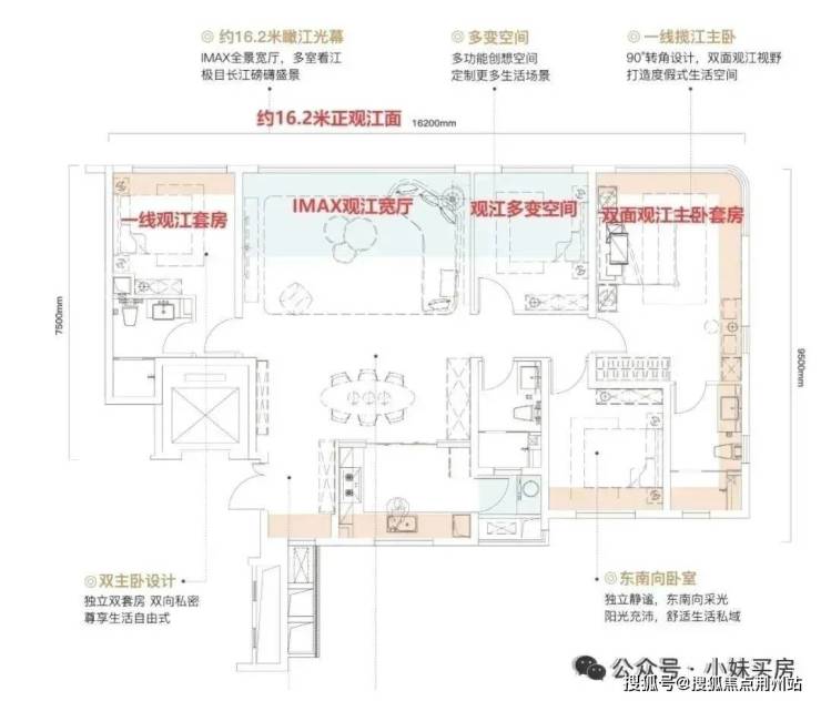 打造了约16.2米IMAX级观江面,实现了客厅+次卧+双主卧四面观江。