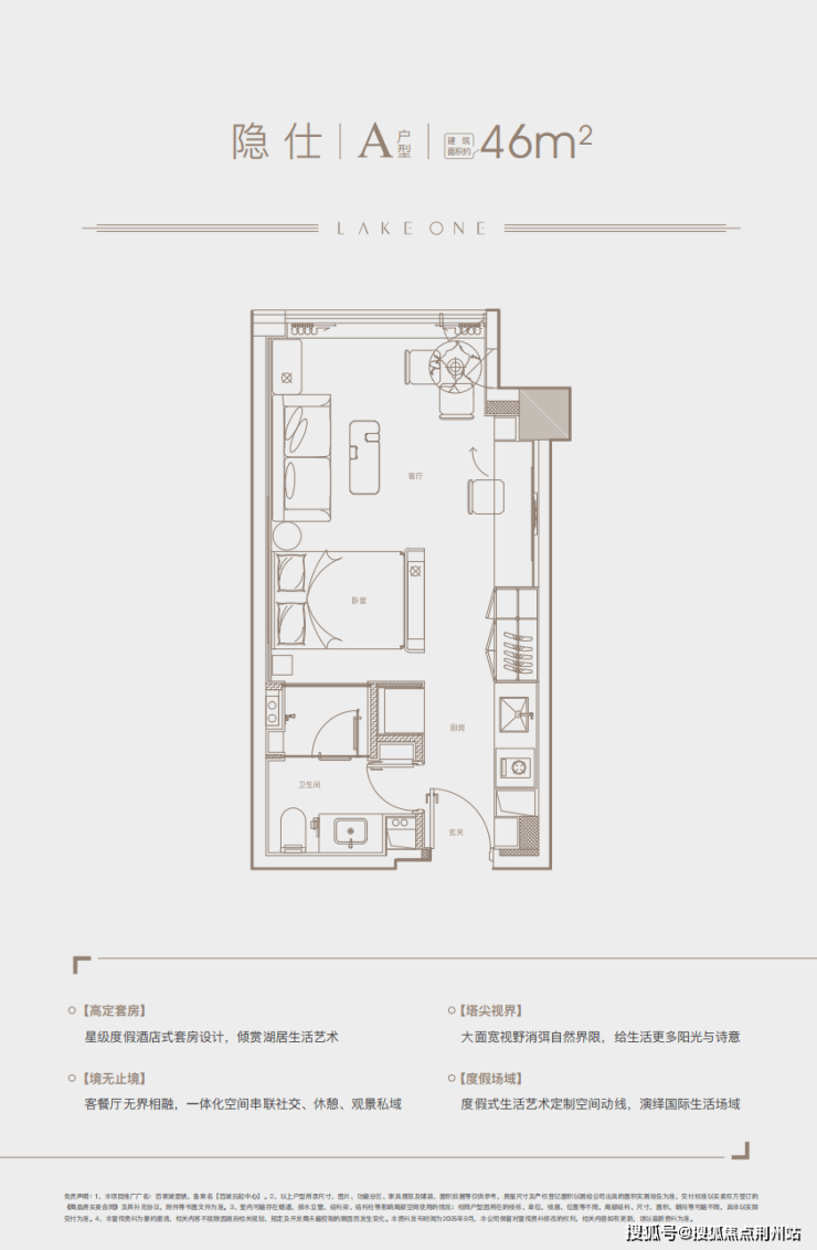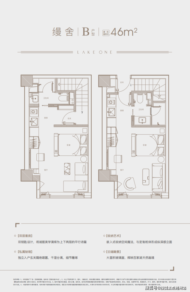 建面约46㎡户型,双钥匙+LOFT设计,4.8米的挑高,2层独立入户,可以达到一层投入,两倍收益的效果。