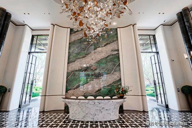 近7米挑高的归家大堂,采用四梁八柱的设计手法,柱子使用了巴西利亚黑奢石,背景墙则采用名贵的皇家翡翠奢石,一石三面,每一块都独一无二;就连接待台都是特选的意大利进口雪花白大理石整石雕刻;大堂地面的定制拼花石材,是太古黑金和雅士白石材组合而成;目之所及的都是艺术奢石,而且工艺和细节经得起考究。