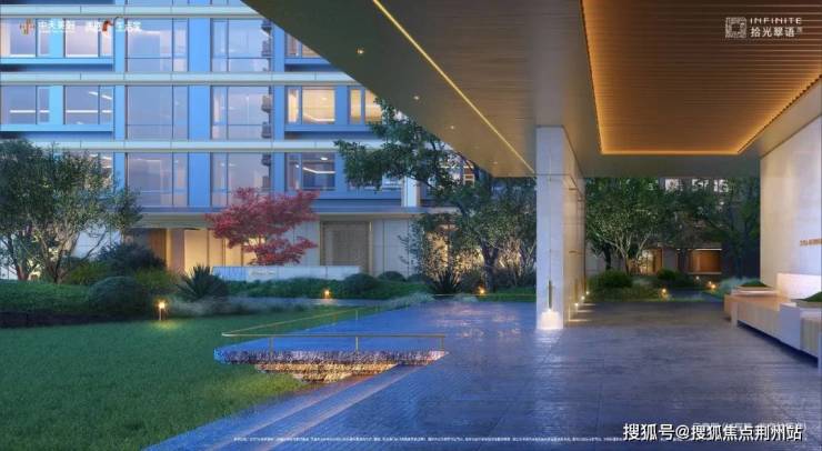 “一轴四境”的景观格局,将大堂、水院、花园、草坪等一一串联,绿洲与水系相伴,归家之路如桃源之境。板块第一个半封闭式架空层,兼容瑜伽、健身、亲子、阅读等功能,