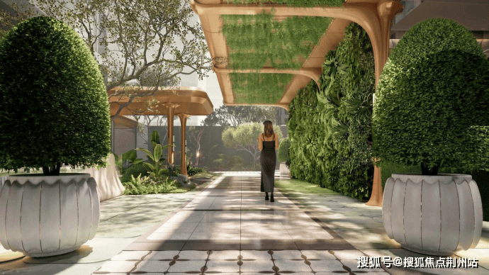 社区将通过入口大门、风雨连廊与架空层灰空间,形成层层递进的景观序列。光影透过廊架洒落,与两侧绿意交织,归家动线在遮蔽与开放之间自然过渡,使行走成为一段富有节奏的花园漫步,形成沉浸式的私密庭园,让归家成为游园体验。