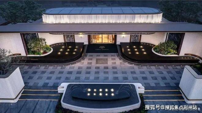 走近门庭,三重弧形石材背景墙+圆角幻彩穿孔顶,搭配潺潺流动的中央水景,营造出星级酒店般的尊贵仪式感。