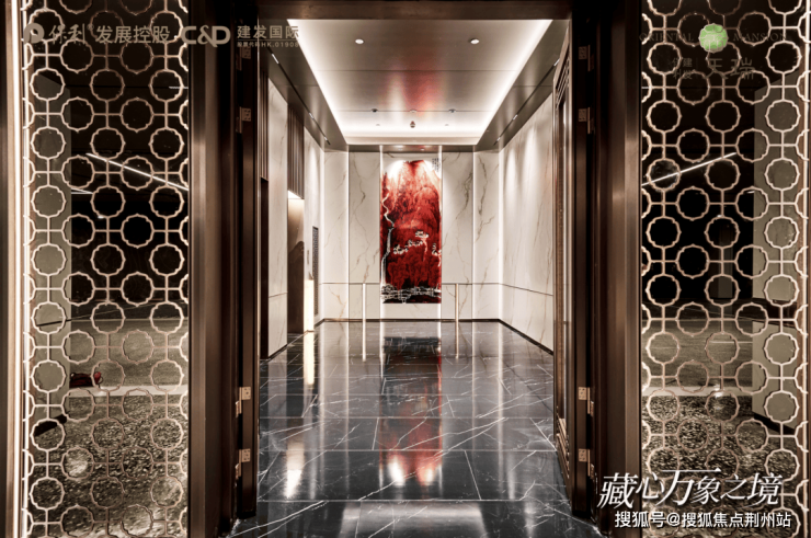地上地下奢装双入户大堂是天瑞的基本操作,材料也选用了大面积天然石材、铝板、不锈钢、普拉达绿的大理石门把手、巴西进口奢石“盛世红颜”景墙等,打造出属于项目的独特气韵。