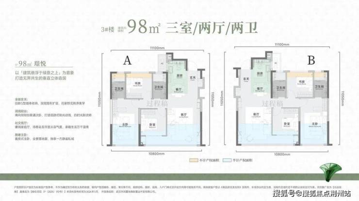 建面约98平三房两厅两卫:3号楼的连廊中间套户型。