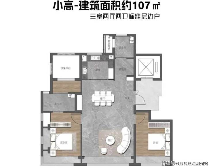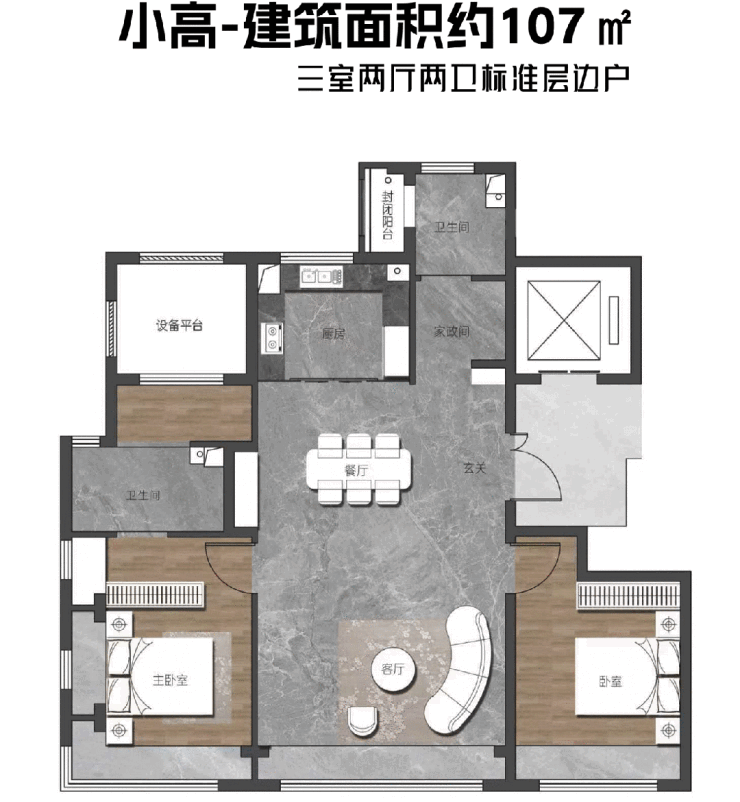 建筑面积约107㎡的小高层户型,采用了「两梯两户纯板式架构」,彻底告别传统两梯四户带连廊设计。