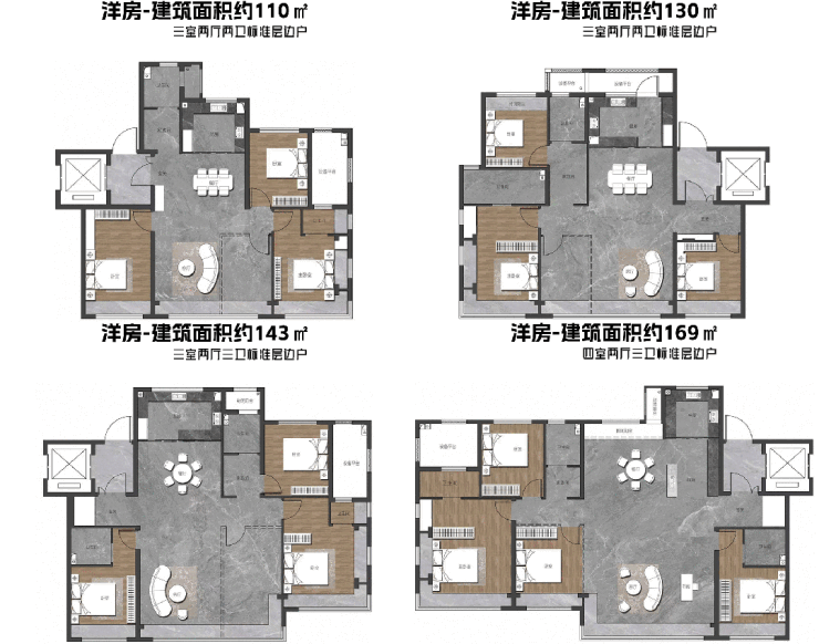 特别是建筑面积约130、143、169㎡三款户型,主卧含飘窗开间分别约3.5、4、4.5米。