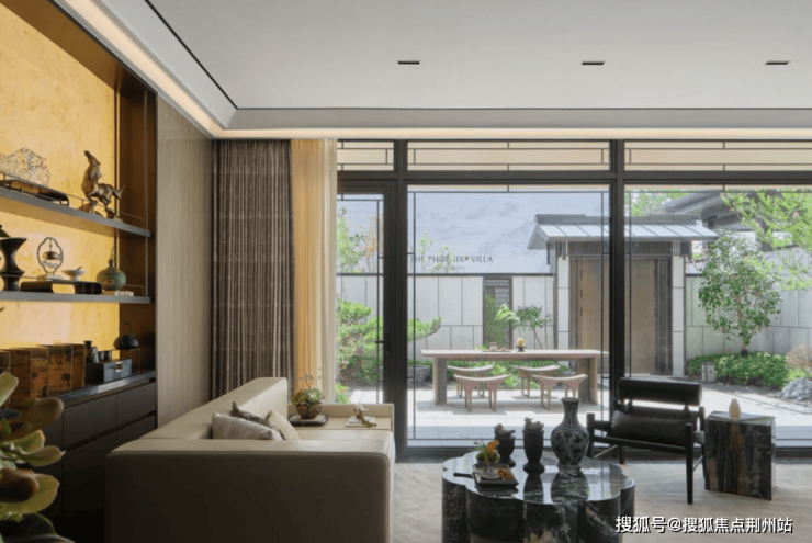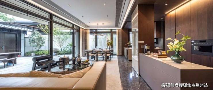 约7.2米的大横厅,搭配大玻璃镜面,直面庭院四季风光,别墅到院子,化实为虚,解构生活,描绘大宅生活尺度。