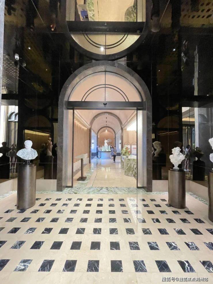 穿过约12米高的大门,来到一个「光影水院」。水院两侧是高达8米的景墙,采用西班牙贝金米黄石材,造价超过500万元。水院中厅的马匹艺术装置,由当代艺术家王从义设计。