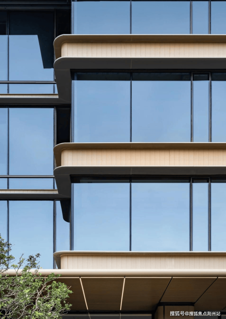 项目建筑设计首层石材干挂+四面铝板+三波两腔玻璃+超高窗墙比配上,高级感和艺术美同时在线。顶端的中式飞檐,东方建筑美学融入现代审美。