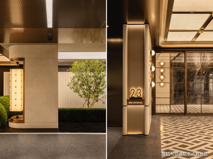 整扇大门采用铜艺精雕,以水波为纹理,两侧夹丝玻璃融入了中国传统吉祥纹“方胜纹”,演绎雅贵的隐奢。近500㎡的环岛落客前庭奢阔大气,港湾环抱式的入口景墙以及酒店式门厅,让每一次归家都能感受到高门大户的尊崇礼遇。