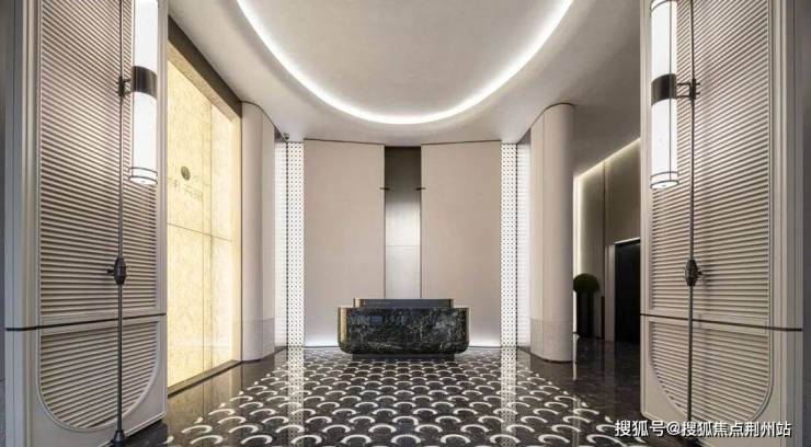 入户处,景墙采用贝金米黄大理石,质地坚实细腻,天然纹理流畅大气。地面则采用芝麻黑水冲面与黑烧面花岗岩两种材质拼花,用材的考究可见一斑。经典的方胜文拼花设计,嵌金属“珺”符号地雕LOGO图案,两侧对称摆放花钵,契合中国传统的“和”文化,寓意家和万事兴,让归家更有仪式感。