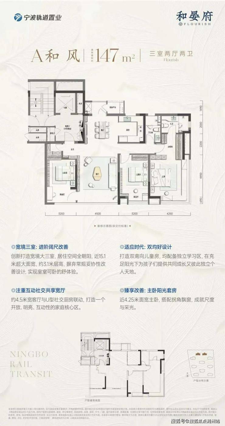 全系户型清一色大户型,建筑面积约147㎡起步,向上到建筑面积约176㎡、建筑面积约202㎡,全部朝南超大面宽,全部主卧配备约270度视野“折叠屏”飘窗,全部采用类一梯一户设计……