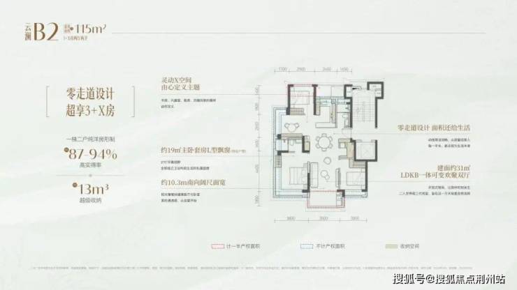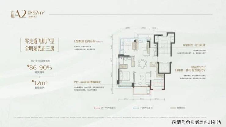 约97㎡「越级洋房」三室两厅两卫,以约86-90%的高实得率,采用零走道飞机户型设计,相当于常规市面产品的109m2产品,实现全明正三房的舒适体验。