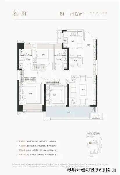 B1户型建面约112平,三房两厅两卫:该户型分布于2号楼的西边,南北朝向,三开间朝南,南北通透,属于常规的边套三房户型。