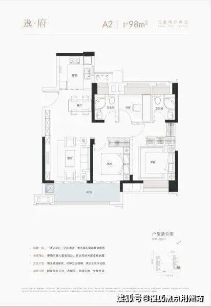 A2户型建面约98平,三房两厅两卫:该户型分布于2号楼的东边,东西朝向,客厅主卧次卧三开间朝东,主卧东西向贯通,冬季日照可能不足。