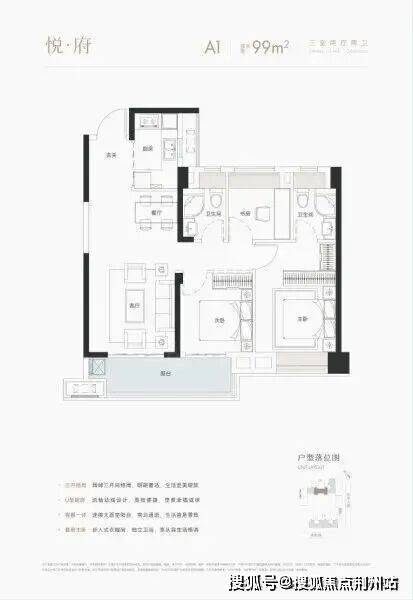 A1户型建面约99平,三房两厅两卫:该户型分布于2号楼中间位置,典型的连廊中间套,南北朝向,除了朝向不同之外,户型结构跟上面98平的基本一样。