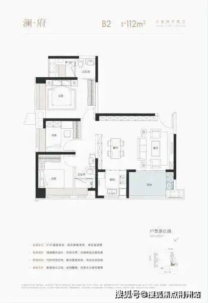 B2户型建面约112平,三房两厅两卫:也是分布在2号楼的东边,东南向双面采光,两个卧室朝南,主卧以及餐客厅阳台以及厨房朝东,非常规户型。