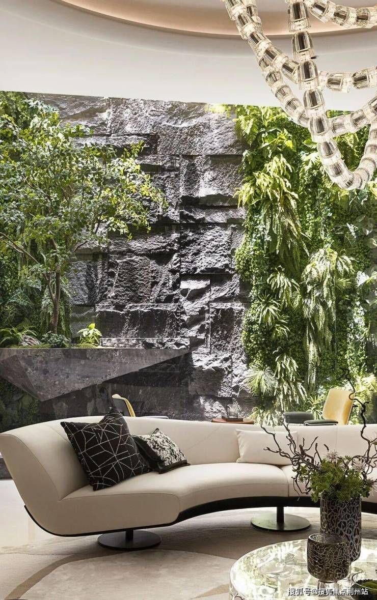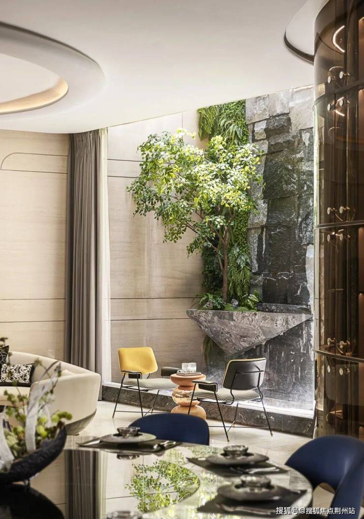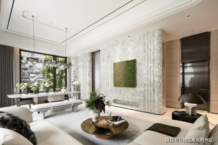 穿过由青砖黛瓦铺设的廊道,从中式庭院步入室内,恍若跨越时空界限,每一步都似踏在云水之间。迎面而来的波浪形大花白石材主墙,其天然纹理如烟云流动,朦胧的绿意与窗外真实的竹石造景形成"画中景,景中画"的互文。