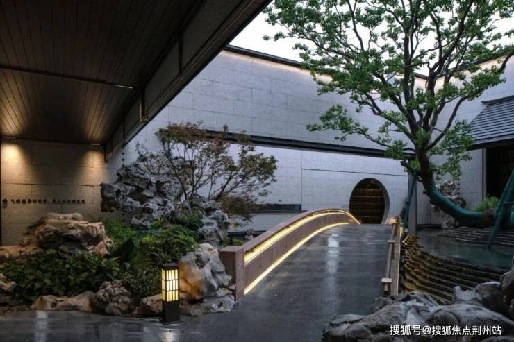 游廊设计灵感源自无锡寄畅园的“清蘌回廊”,廊墙之上开凿圆形墙洞,水底以宋代米芾《研山铭》为蓝本,采用白玉嵌金工艺铺就,既传承了文人赏石的雅致传统,又通过现代技法赋予水景金石韵味,负阴抱阳,虚实相生。
