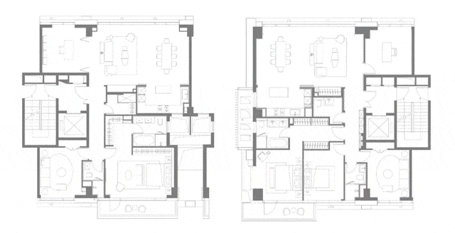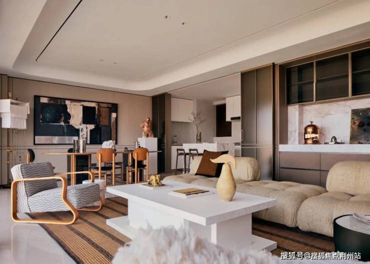 大面落地窗让自然光贯穿公共区,提升空间通透感。餐桌和客厅沙发朝向均有良好景观面,江景或城市景观成为室内背景。