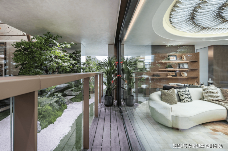装饰廊架以约1.2米安全高度搭配通透玻璃栏板,既确保安全又不遮挡视野。相较于传统阳台,这一设计在提升空间利用率的同时,将自然景观融入日常生活,为养花种草、品茗会友等居家场景提供了理想空间。