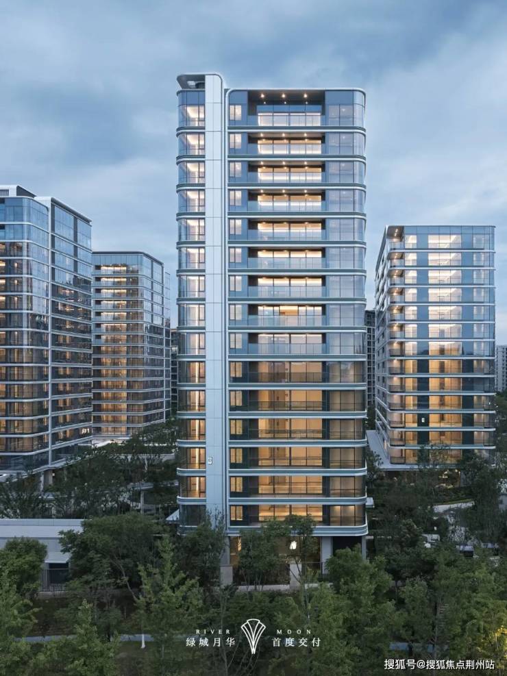 杭州芝澜月华轩外立面以玻璃搭配转角圆弧,加之自带人文情怀的灰绿陶板线条,呈现杭州人居的温润气质。