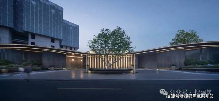 大门不止很有气场,而且还很讲究江南韵味。入口的景墙用弧面石材形成园区照壁,中间用格栅做出月洞门的意象,不经意间就把江南园林的韵味融了进去。
