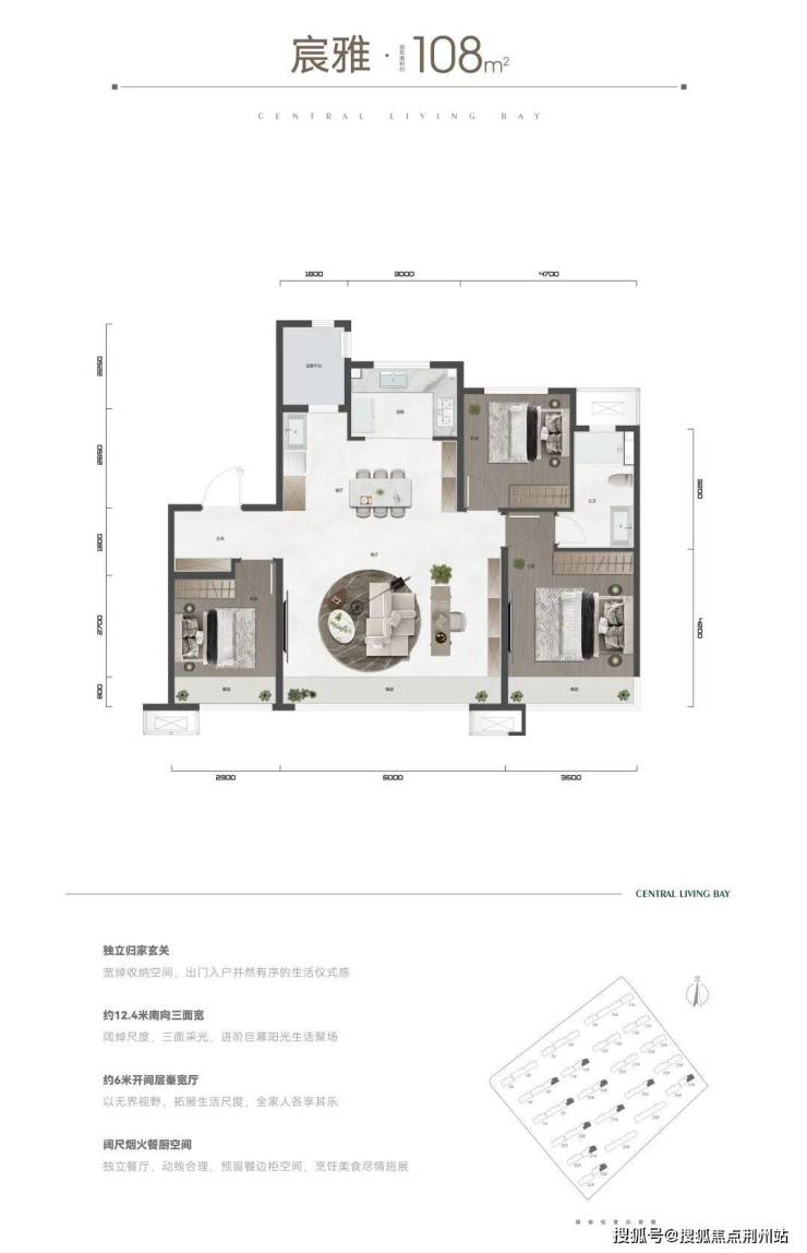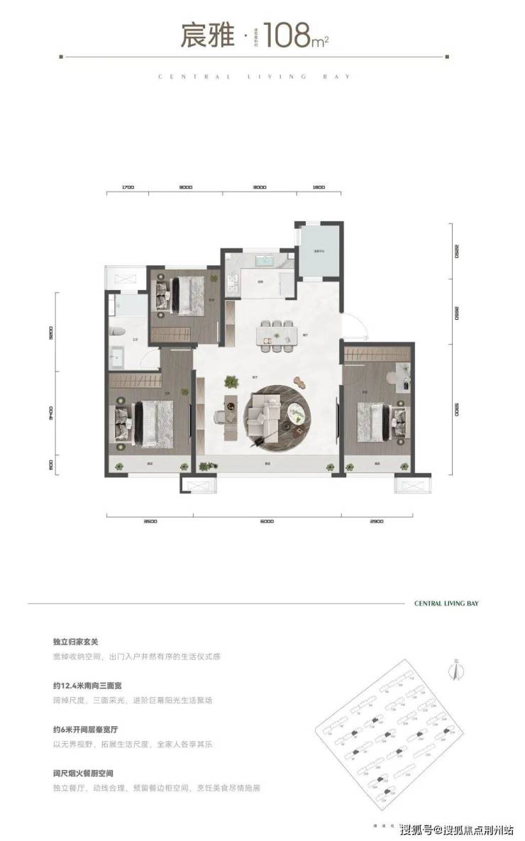 108㎡产品约12.4m南向三面宽,客厅开间为6m。