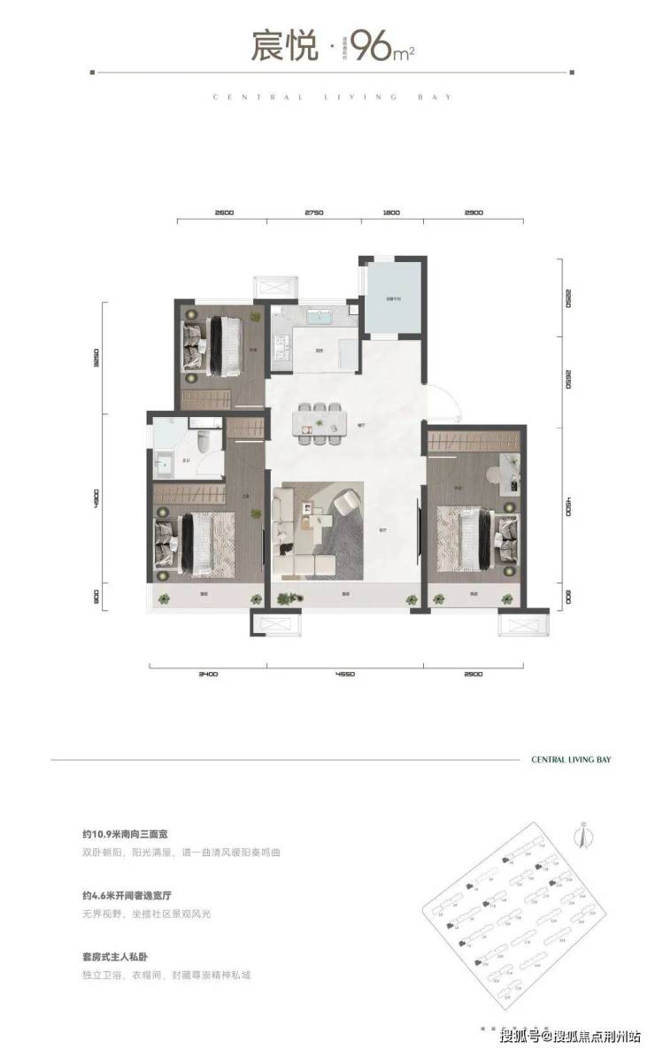 其中一期住宅容积率1.5,5-11F全洋房社区,共826户。产品面积为96㎡、108㎡及120㎡。户型揭秘简单来说,108㎡及120㎡均相当于96㎡产品放大版。均为全落地窗设计,区别主要在客厅开间、厨房和次卧面积上。据项目宣传,南向飘窗在后期交付后,由开发商拆除作为套内面积供业主使用。北向设备平台也会装修成次卫,整体套内面积使用率极高!96㎡及108㎡产品得房率可达90%以上!96㎡产品约10.9m南向三面宽,客厅开间4.55m,套房式主卧。