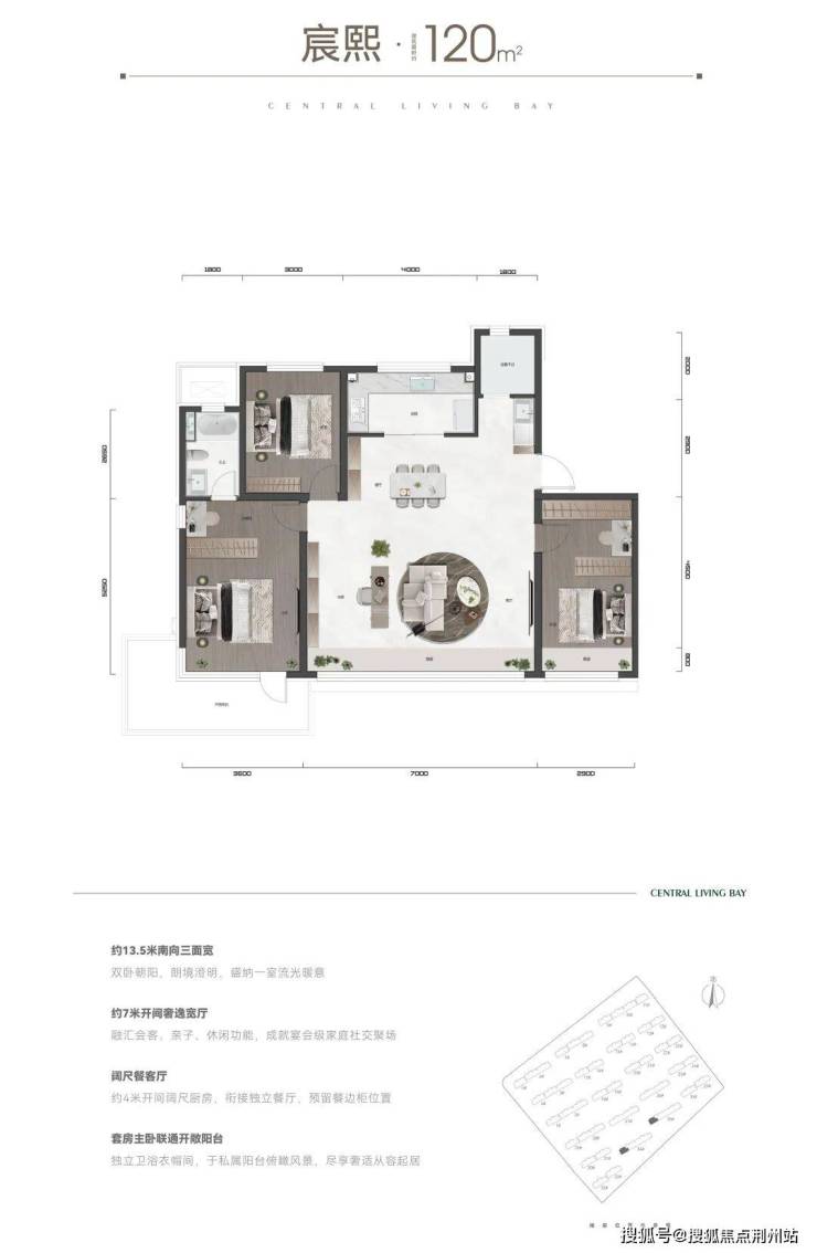 120㎡产品为项目唯一南向主卧室带露台设计的产品,得房率可达100%!约13.5m的南向三面宽,客厅开间为7m,套房主卧联通开敞阳台。还可以改造客厅变四室,提高房屋功能空间使用率。