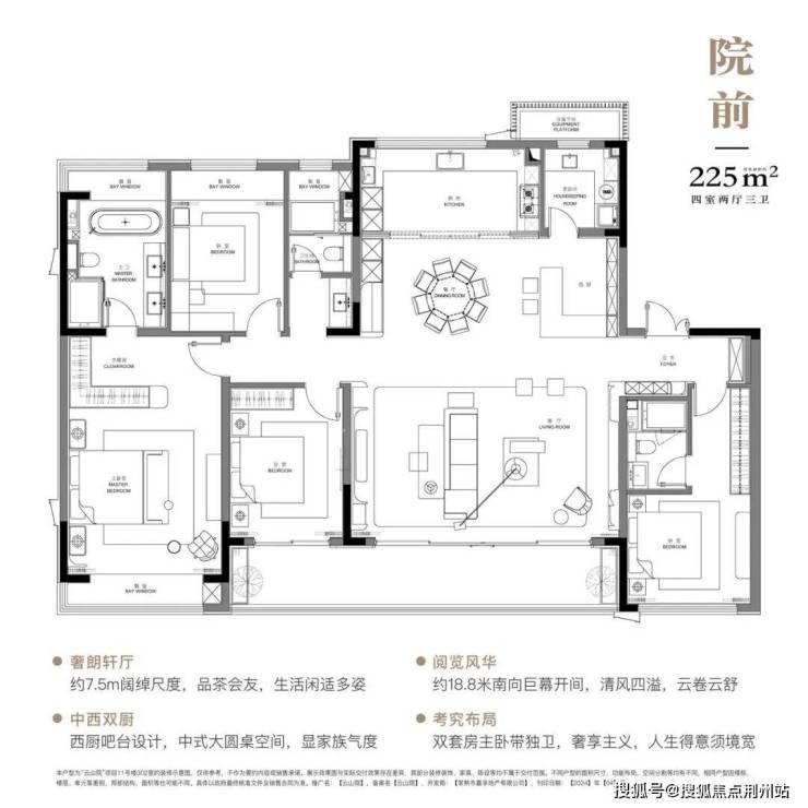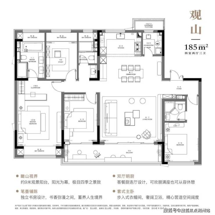 约185㎡的产品,整体的朝南面宽达到约16.5米,约5.8米开间超大客厅、南向约9米长的阳台,都是非常改善的尺度。