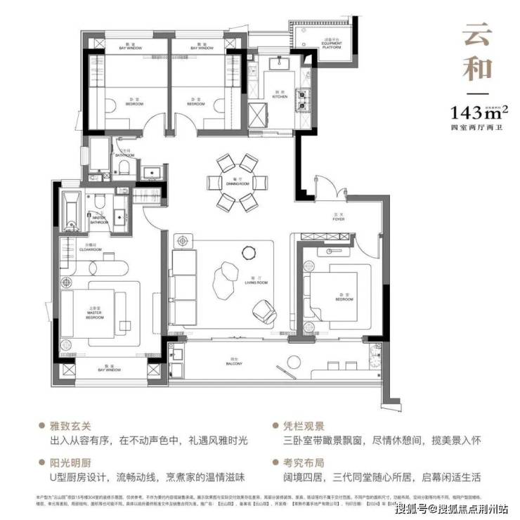 约143㎡户型,整体是一个“四叶草型”的布局,3开间+2卧朝南带双阳台,另外2个房间布局在户型的北侧。